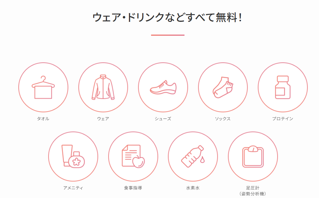 | 設備・サービス | トレーニングウェア・タオル・ソックス等の無料レンタルで手ぶらOK。 |