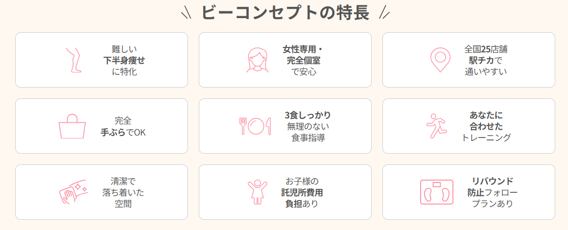 A10:ビーコンセプトの店舗は「完全個室・女性専用・子連れOK・ベビーカーごと入店可」とされており、忙しい主婦・子育て中の女性でも通いやすいです。ただし、「託児所を併設していない」ため、お子さまを施設内に預けることはできません。 代わりに、「普段ご利用の託児所の利用料金を、1回につき最大1,000円を上限として補助」する仕組みがあります。 実際の負担は軽くなり、より通い続けやすくなります。