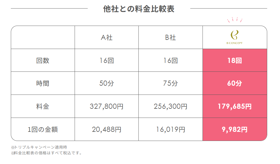 ビーコンセプトの2ヶ月コース(16回)は、**179,685円(税込・入会金0円)**で、他社と比較して「やや安め〜中間価格帯」に位置します。