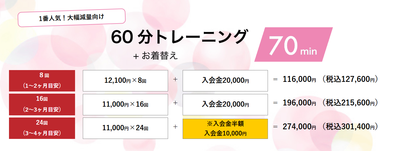 | 60分トレーニング+お着替え(合計70分) | 本格的に体を変えたい女性向け。筋トレ・有酸素・ストレッチをバランス良く実施。プロテイン無料。 | 8回:20,000円 16回:20,000円 24回:10,000円 | 8回:96,800円 16回:176,000円 24回:264,000円 | 8回:116,000円 (税込127,600円) 16回:196,000円 (税込215,600円) 24回:274,000円 (税込301,400円) |