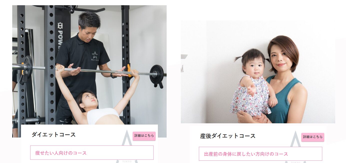 NEXT GYM TOKYOのコースは、25〜35歳のダイエットOLから、産後の体型戻しに挑む40代ママまで、幅広い悩みに寄り添うラインナップ。