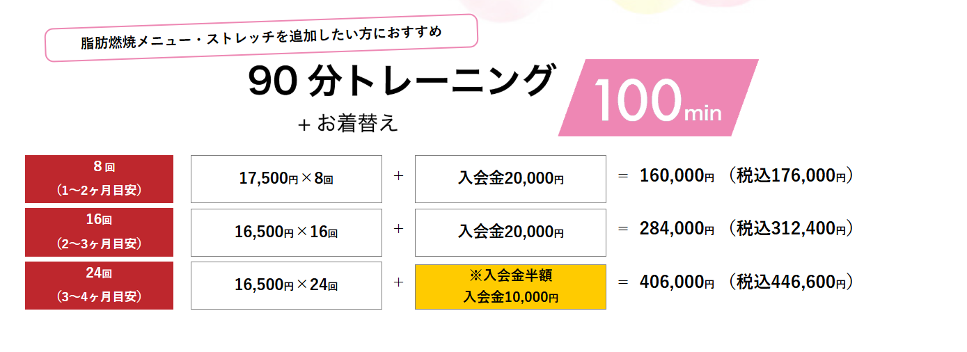 | 90分トレーニング+お着替え(合計100分) | 上級者向けロングコース。筋力・有酸素・柔軟ケアを徹底。産後回復や休日トレに最適。 | 8回:20,000円 16回:20,000円 24回:10,000円 | 8回:140,000円 16回:264,000円 24回:396,000円 | 8回:160,000円 (税込176,000円) 16回:284,000円 (税込312,400円) 24回:406,000円 (税込446,600円) |