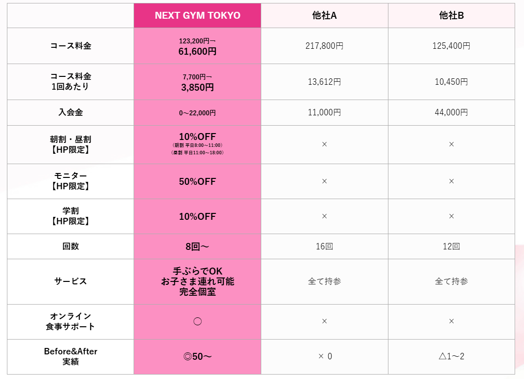 大手は2ヶ月30〜40万円が一般的ですが、NEXT GYM TOKYOは8回92,400円〜と始めやすく、16回・24回でも1回単価が下がる仕組みで、継続前提の女性にとって負担が少ないのが特徴です。