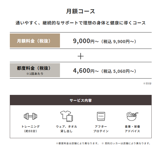 | 月額コース | 通いやすく、継続的なサポートで理想の身体と健康に導くコース | 33,000円 | 月額料金9,900円~ 都度料金5,060円~※1回あたり ※都度料金は店舗により異なります。 ※ 契約ロッカーは店舗により異なります。 | トレーニング(約55分) ウェア、タオル貸出 アフタープロテイン 食事・栄養アドバイス |