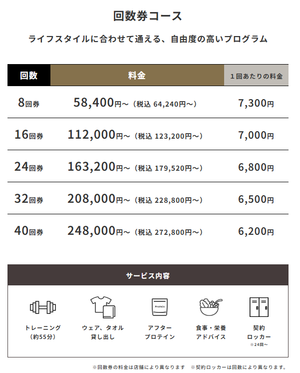 | 回数券コース | ライフスタイルに合わせて通える、自由度の高いプログラム | 8回券 64,240円~ 16回券123,200円~ 24回券179,520円~ 32回券228,800円~ 40回券272,800円~ ※回数券の料金は店舗により異なります ※契約ロッカーは回数により異なります。 | トレーニング(約55分) ウェア、タオル貸出 アフタープロテイン 食事・栄養アドバイス 契約ロッカー ※24回~ |