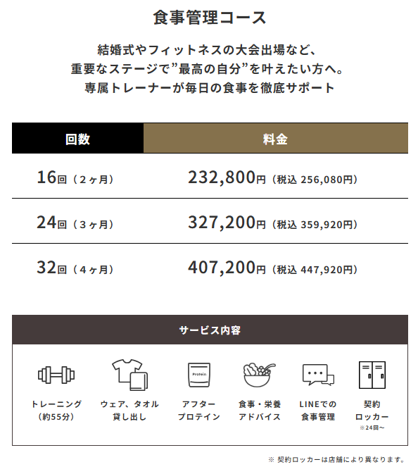 | 食事管理コース | 結婚式やフィットネスの大会出場など、重要なステージで”最高の自分”を叶えたい方へ。 専属トレーナーが毎日の食事を徹底サポート | 16回(2ヶ月)256,080円 24回(3ヶ月)359,920円 32回(4ヶ月)447,920円 | トレーニング(約55分) ウェア、タオル貸出 アフタープロテイン 食事・栄養アドバイス LINEでの食事管理 契約ロッカー ※24回~ |