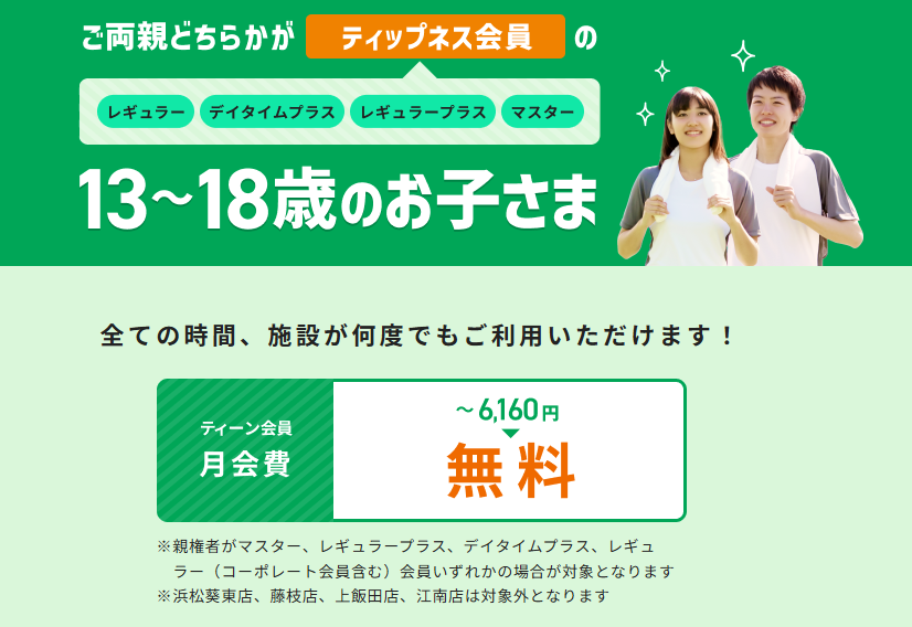 両親どちらかがティップネス会員の【13~18歳の子ども】は無料!