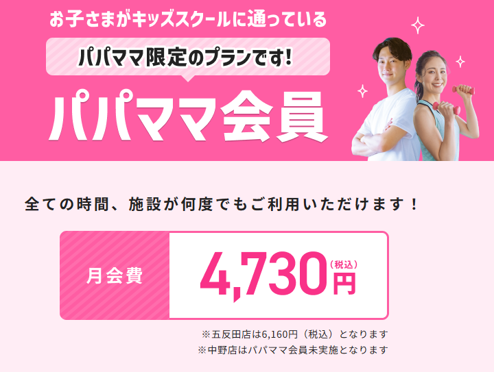 子どもがキッズスクールに通っている場合、パパママ限定のパパママ会員になることができます。