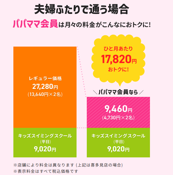 夫婦ふたりで通う場合は上記のようにひと月当たり17,280円お得になります(店舗により異なる)。