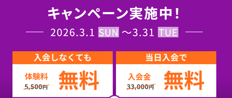 ➀入会金+体験無料キャンペーン(3/31まで)