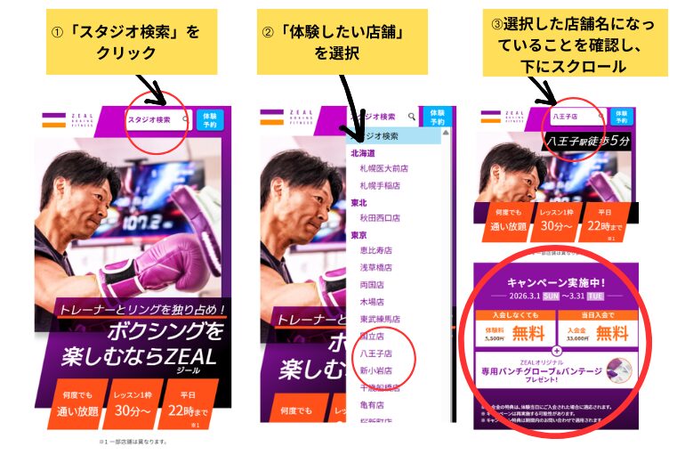 ZEAL BOXING FITNESSは店舗によってキャンペーンが異なります。必ず最新情報は公式サイトの各店舗ページでご確認ください。